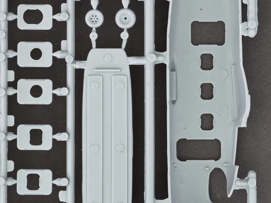 Der Bausatz macht einen soliden Eindruck, mit großteils sauberen Gravuren und einer vernünftigen Aufteilung der Baugruppen. Speziell im Innenraum ist die Detailierung allerdings leider sehr mager.